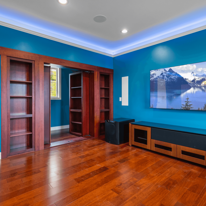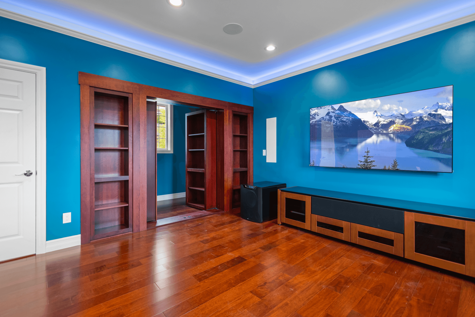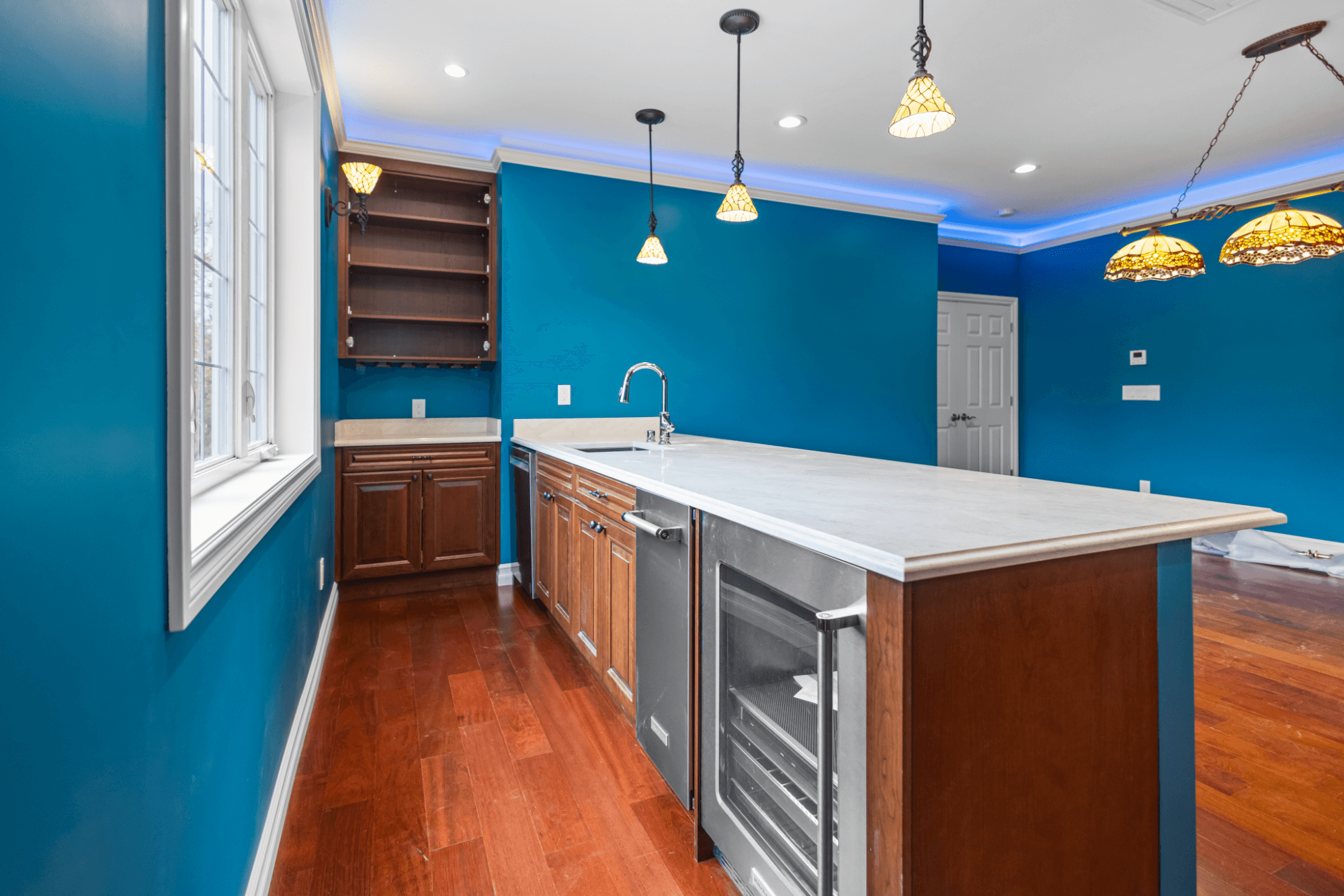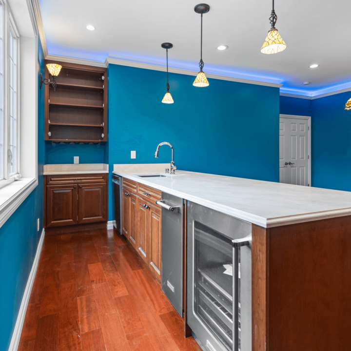The Game room consisted of a full bar with modern stainless steel appliances, built-in low-voltage custom surround system, and traditional billiard style lighting fixtures. The finishes consisted of exotic Brazilian Cherry wood floors, stained Cherry wood cabinets with custom stained glass inserts, and new quartz